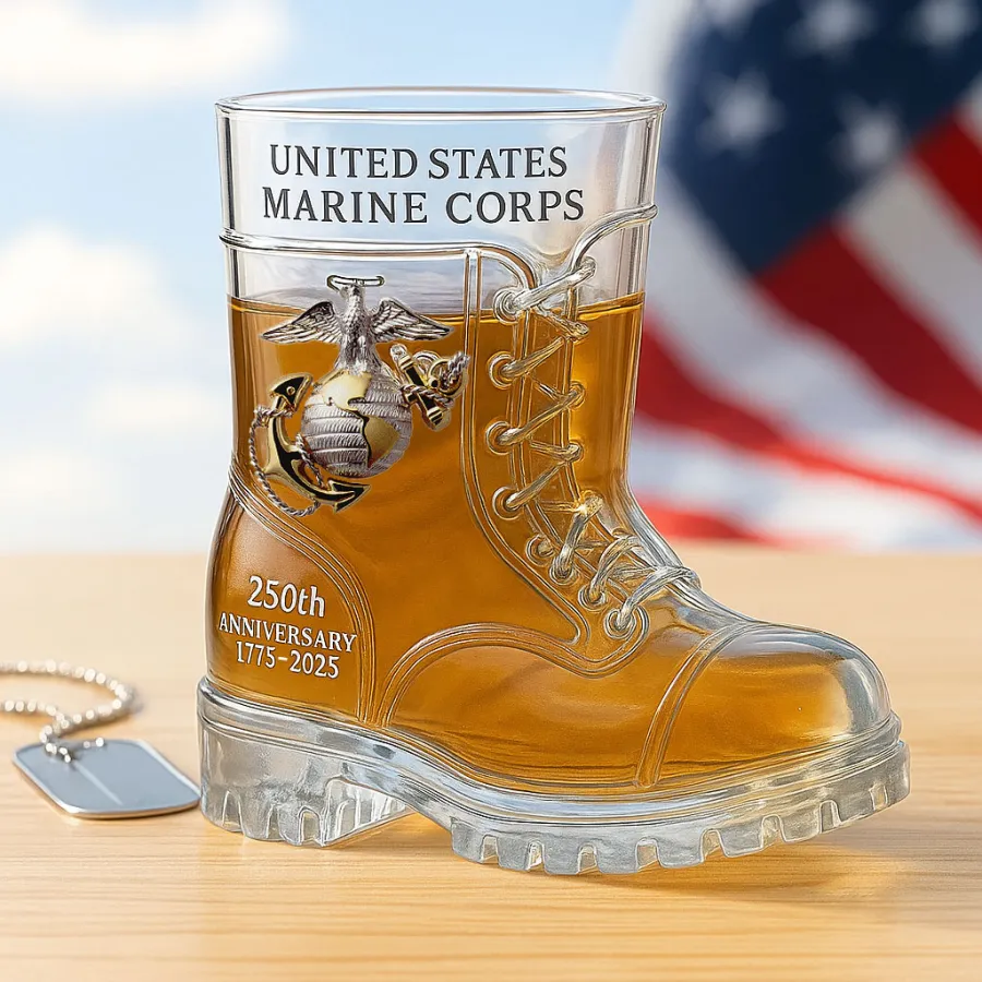 🏅🦅Raise a toast to 250 years of Marine Corps pride with this boot-shaped commemorative glass, honoring every Marine who has ever laced up and stepped out.