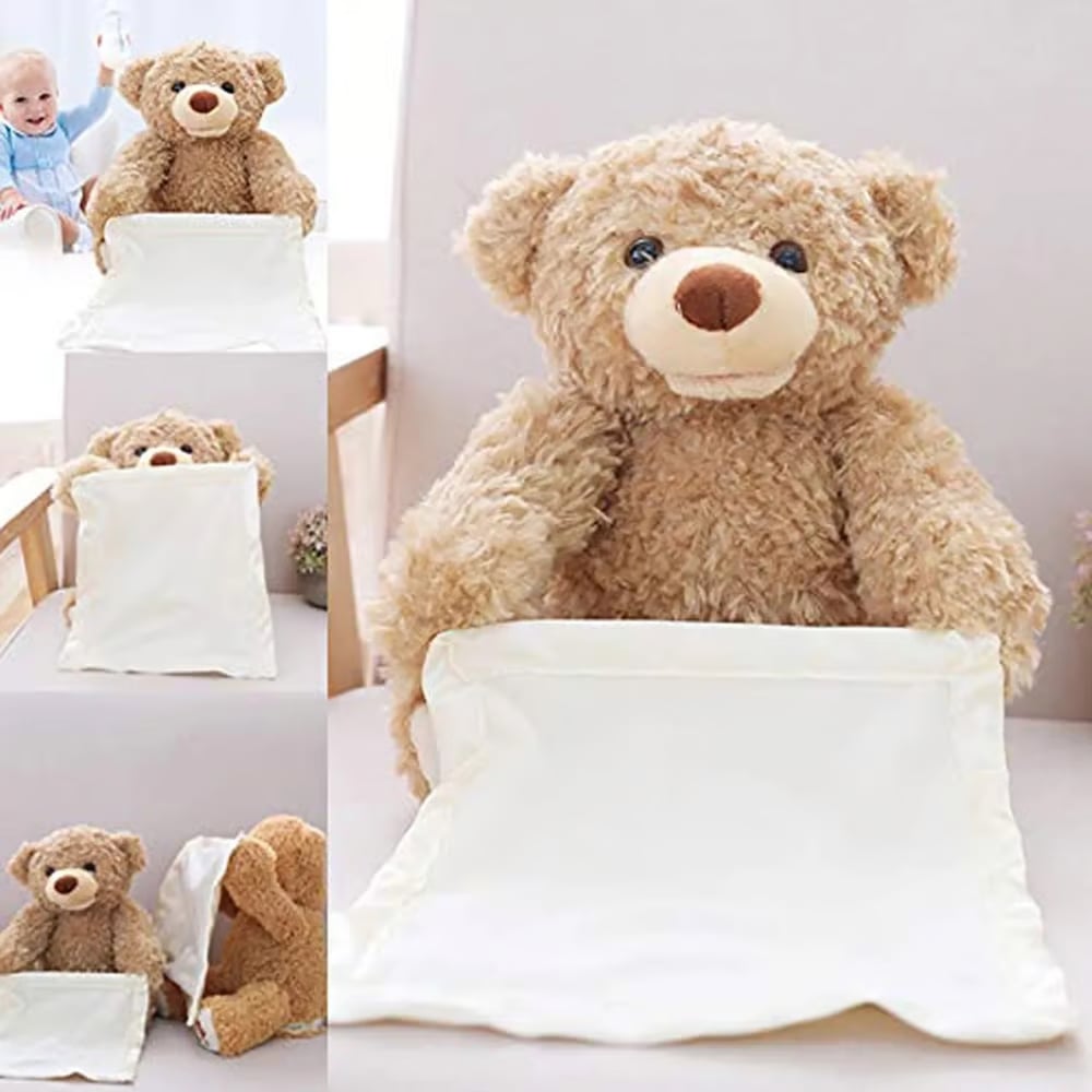 Step into a world of wonder with our Peek-A-Boo Bear! 🐻 This enchanting plush companion brings the timeless game of peek-a-boo to life with captivating movements and endearing phrases, creating moments of pure joy and laughter for your little one. 🤗 With each press of its foot, the bear's cream-colored blanket rises and falls, inviting your baby to join in the delightful game.