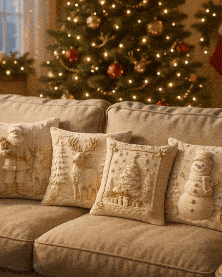 Each pillow cover brings Christmas magic to life with Santa and his reindeer, a festive tree, a sparkling snowman, and a golden-decorated deer. Together they create a warm, joyful atmosphere that instantly brightens any room.