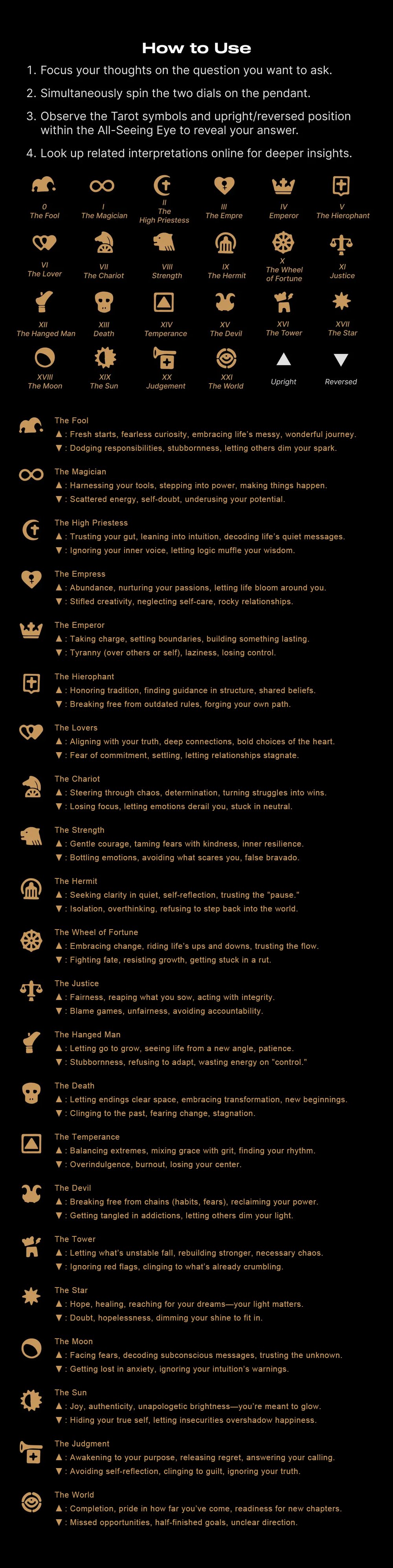 22 Major Arcana symbols adorn the outer ring; the brass center mirrors upright/reversed energies. Your Tarot deck, condensed—wisdom at a glance, always within reach. 💫