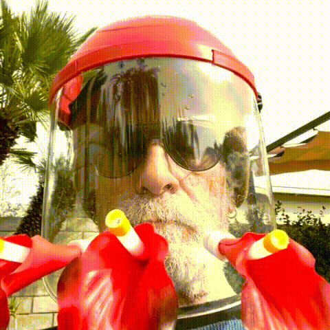 The wearable feeder's red color and various cut-out patterns sparkle in the sunlight and attract hummingbirds. They are drawn to the feeder and settle in.