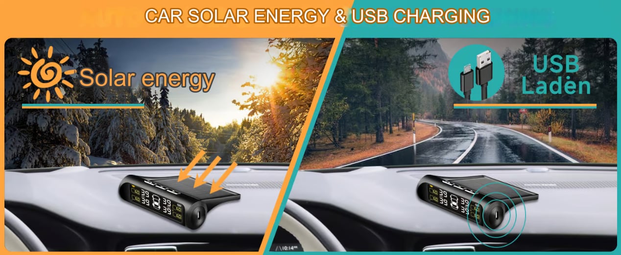 Automatic Solar Charging and USB Charging: The tire pressure monitoring system is automatically charged by solar energy and uses higher quality and longer lasting solar lithium battery panels. It can also be charged by USB when there is no sun, allowing you to focus on driving instead of the battery power of the tire pressure monitoring system.