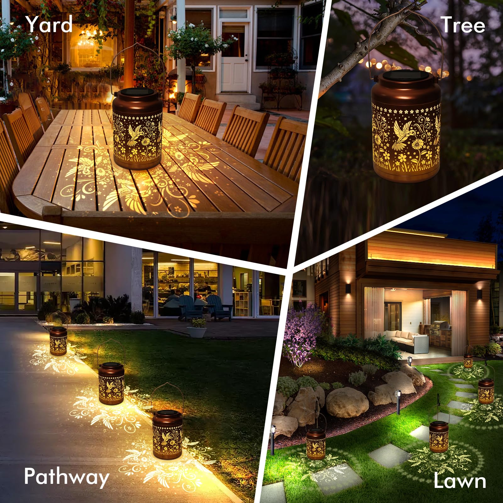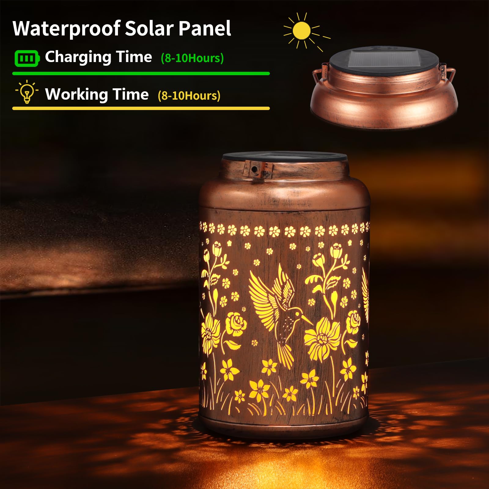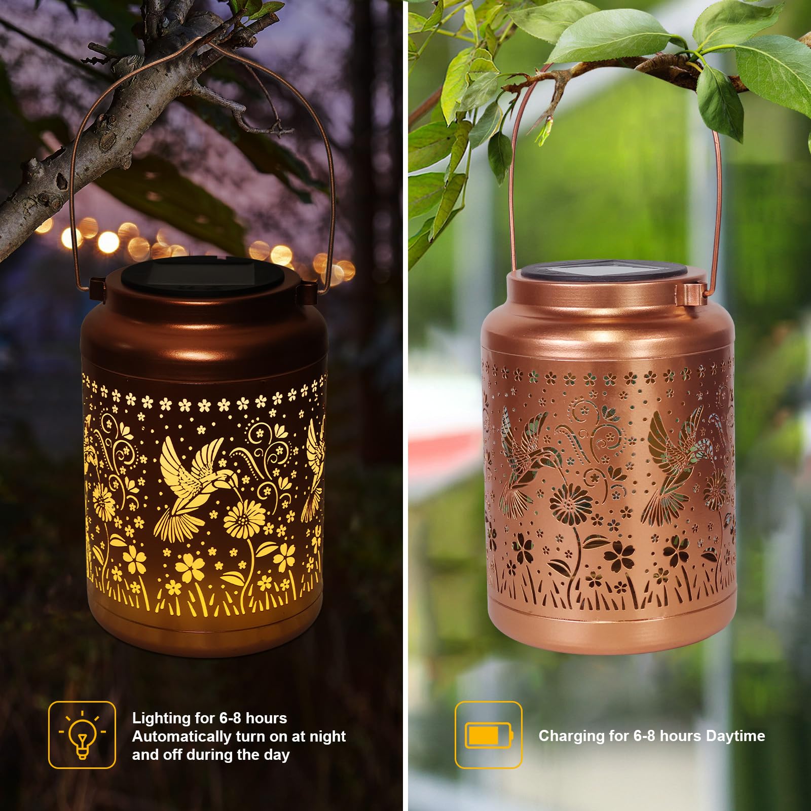 Graceful Decorative Design: The retro appearance, with gold copper color and hollow out metal veneer, the solar outdoor lanterns casts bright and warm light in darkness, accompanied by gorgeous and graceful hummingbird patterns, adding a beautiful atmosphere to the surrounding environment.