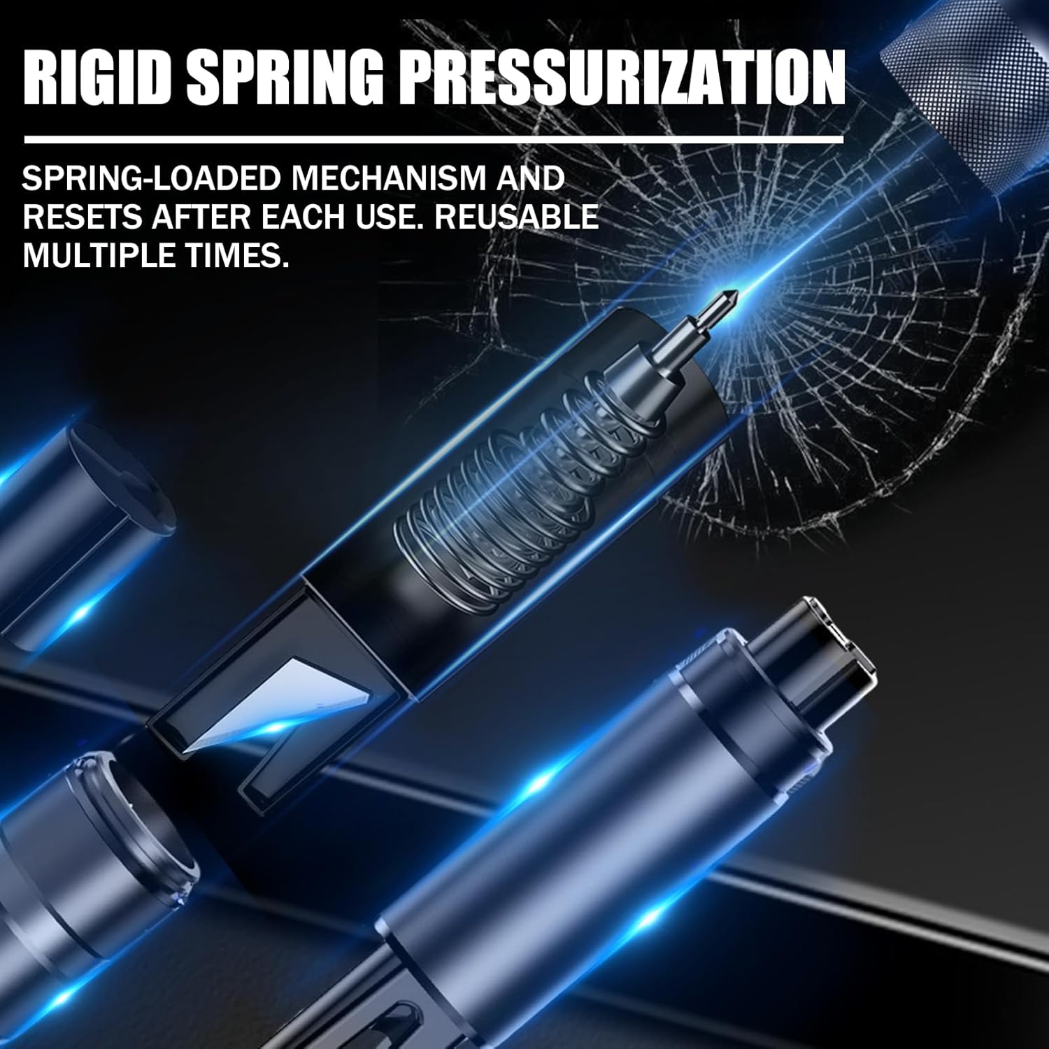 Powerful Gun Spring: Breaker car window breaker solid, heavy-duty, tungsten steel drill easily breaks tempered glass car side windows. Hit preferably one of the corners of the window. Spring-loaded mechanism and resets after each use. Reusable multiple times.