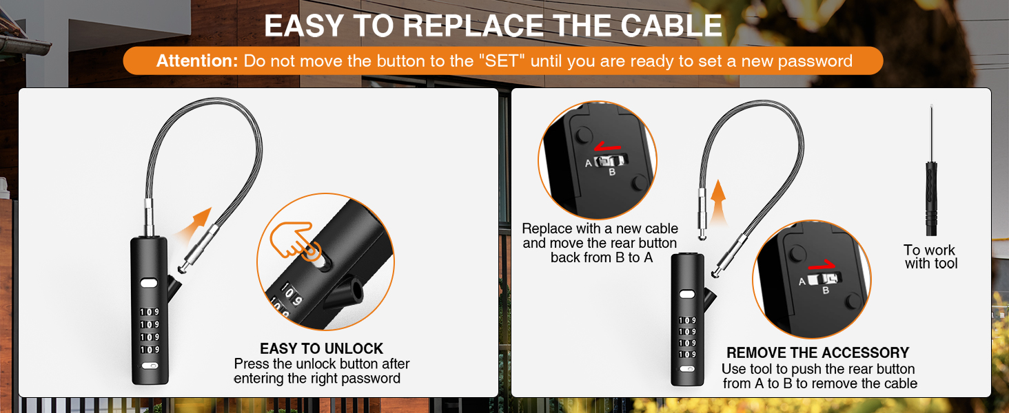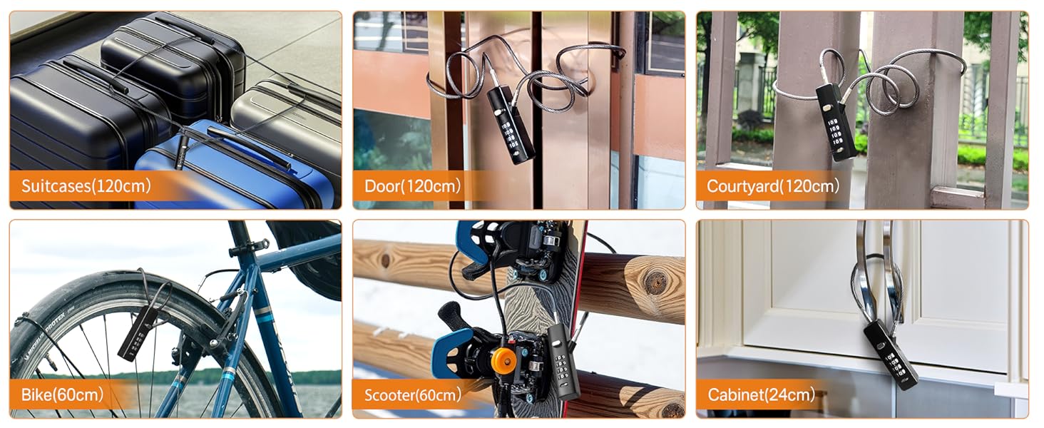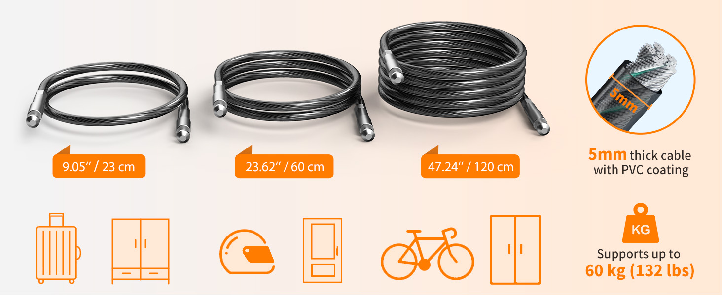 【3 Replaceable Ropes】: This Combination Rope Lock comes with three flexible steel cables in lengths of 9" (23 cm), 23.6" (60 cm), and 47.2"(120 cm). The cables can be easily detached and replaced to suit various scenarios, such as cabinet doors, bicycles, and small doors